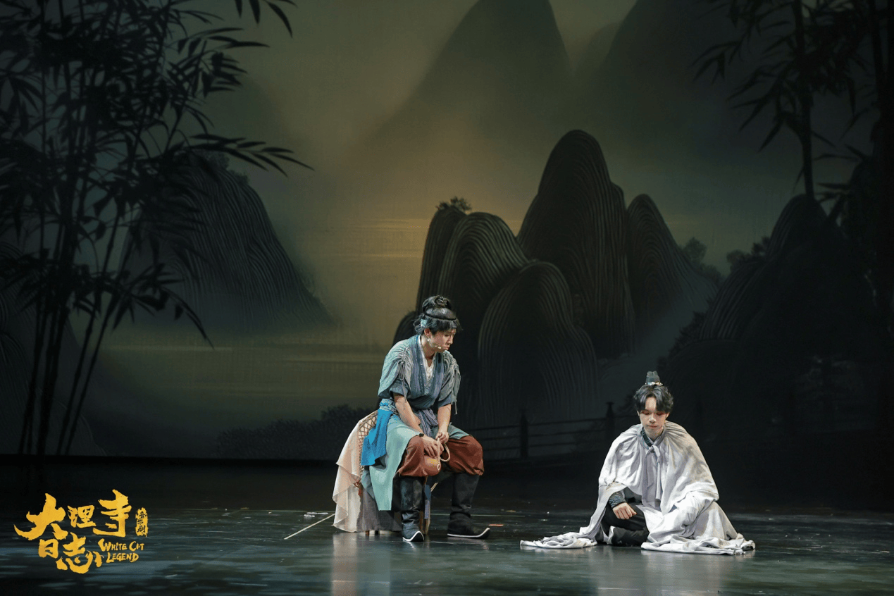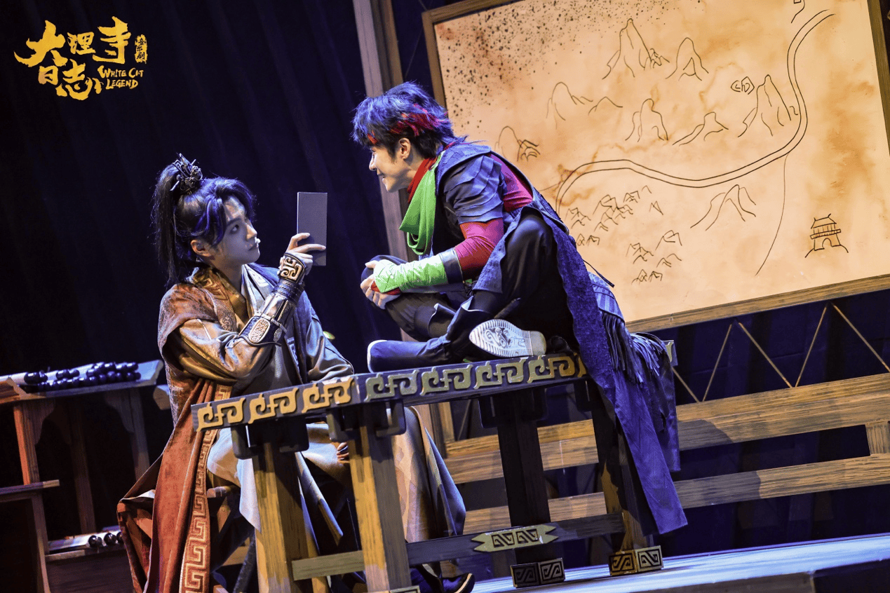 据介绍,剧目的音乐制作全部采用实录方式,并邀请国家级民乐演奏家加入,其中最复杂的歌曲其和声达到八轨编制,实现国内原创音乐剧的新突破;编舞方面则融入了傩戏等传统戏剧元素,以增加打斗场景的舞台表现力;此外,在服装设计上,该剧也旨在打造一个贯通古今的“风”视觉世界,通过溯源唐代风骨和融入当代审美,更好地服务现代音乐剧的舞台美学需求。原著漫画中二次元角色的标志性特征也均被巧妙地转化为三维的、可穿的服装语言,不仅令IP的动漫粉丝瞬间会心一笑,也让更多观众在剧场里直观感受到角色的独特魅力。另外值得一提的是,少卿李饼的白猫形态,更是得到了百年匠心的上海木偶剧团鼎力协助,以巨型可动式机械木偶的形式呈现于舞台,活灵活现,让人眼前一亮。